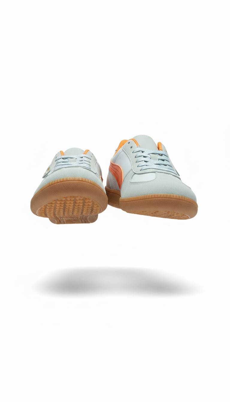 A classic low-profile terrace sneaker featuring a clean pale-blue (arctic) upper with a vibrant orange leather formstrip.